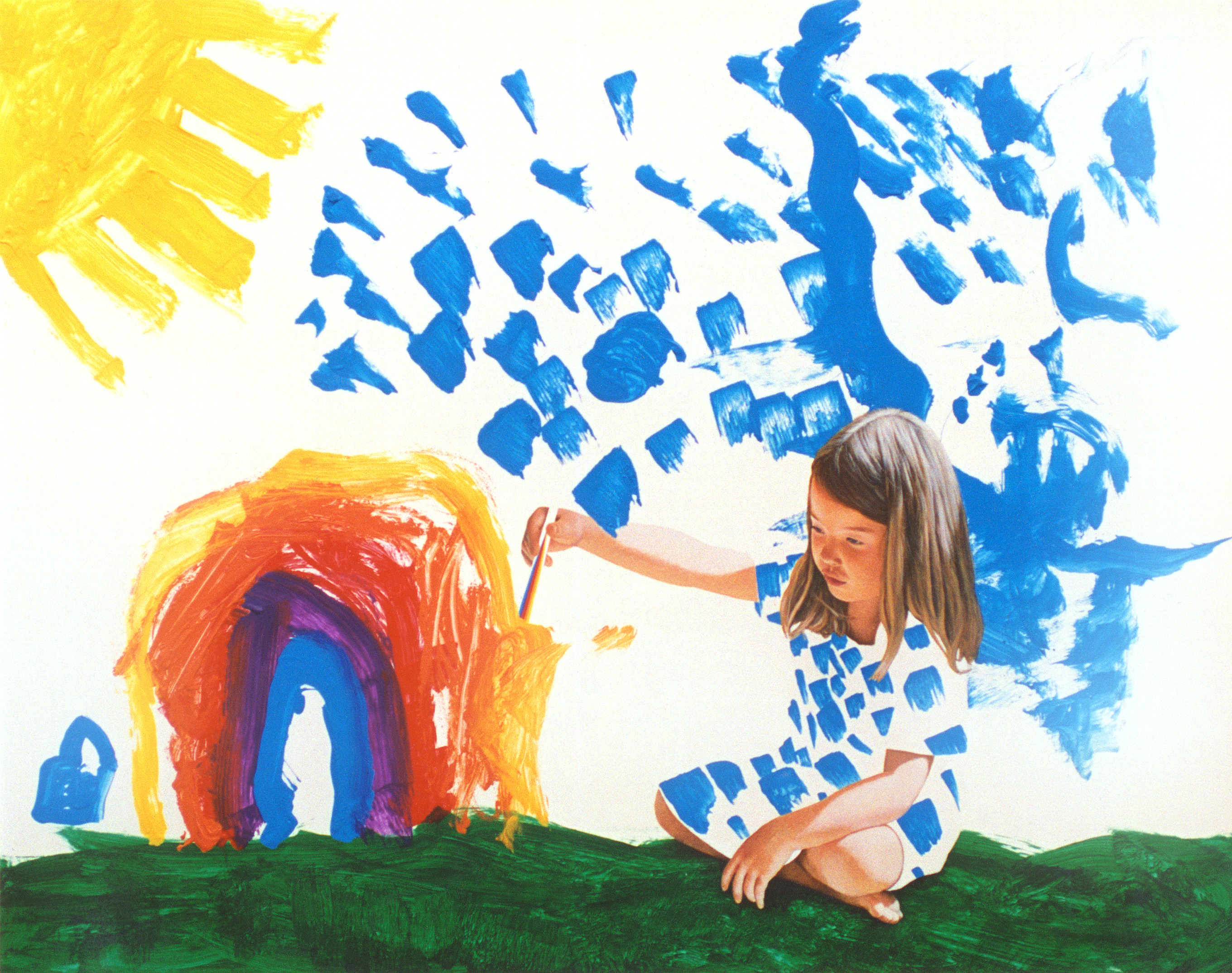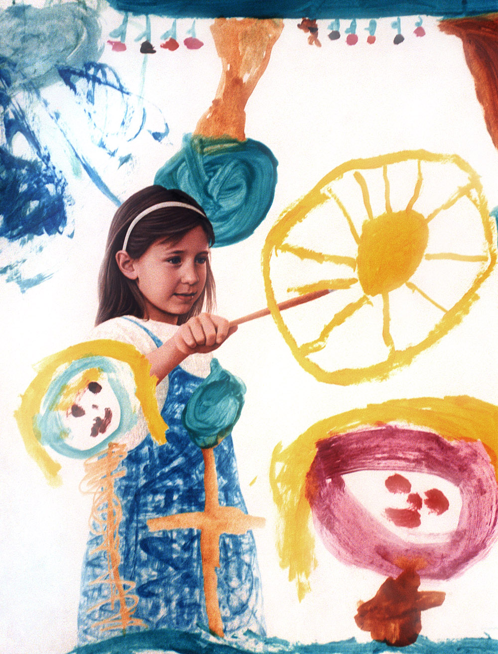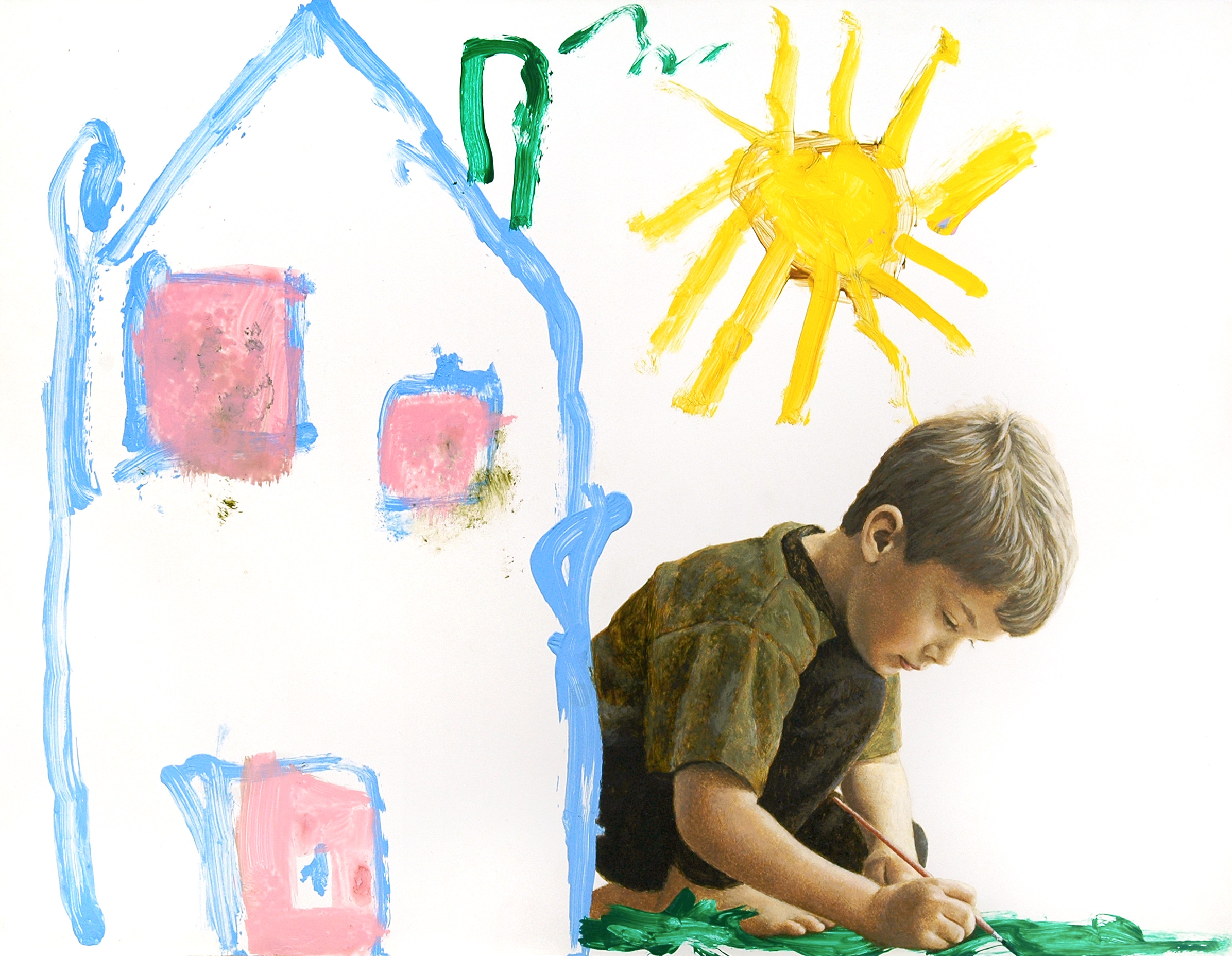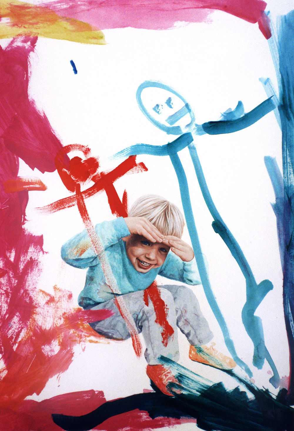 Children set the scene for their own portraits, encouraged to paint as they please. Along with the children, Morris imagines how they might appear within their paintings. He then takes photos, from which he hand-paints the portraits directly onto the children's paintings.