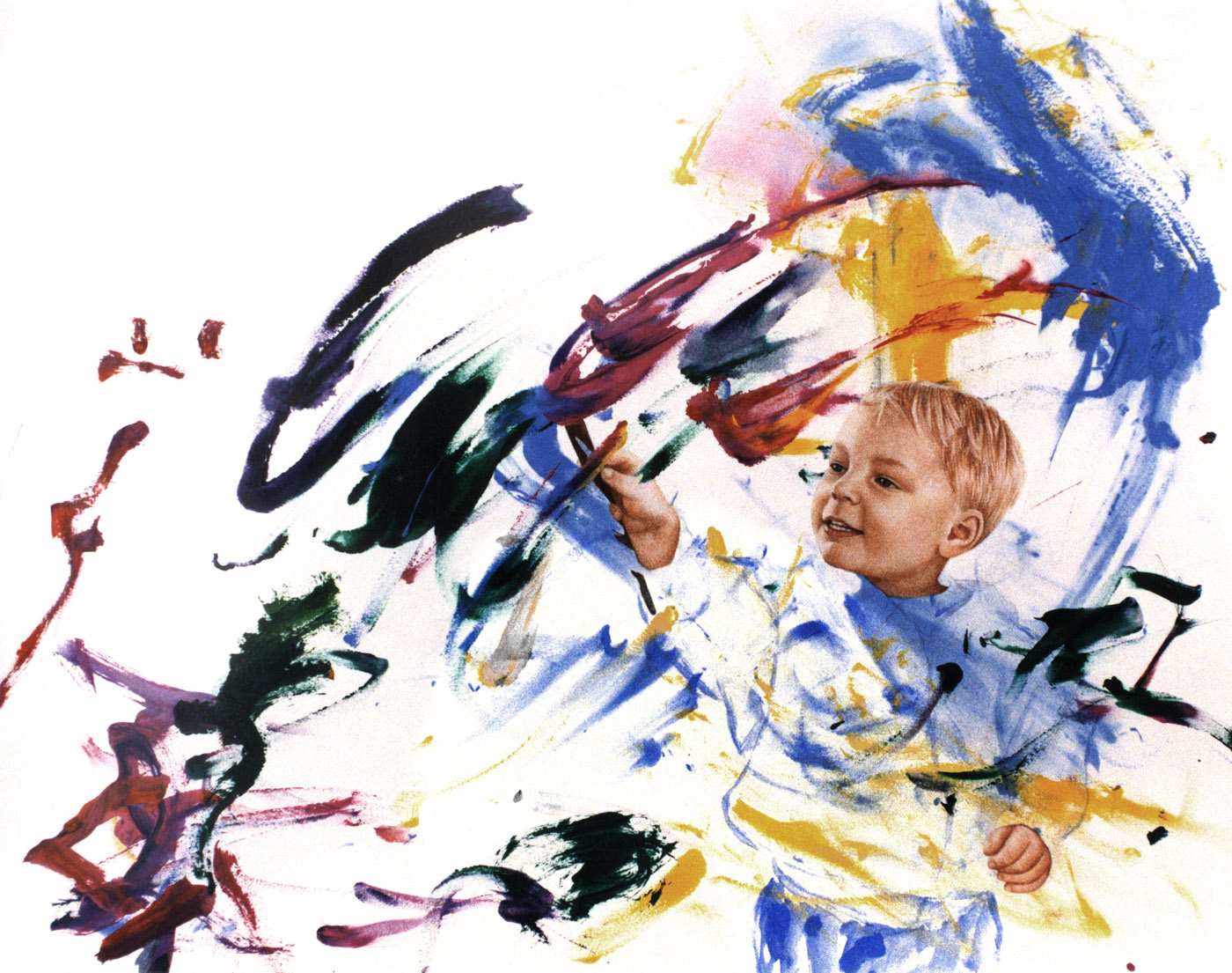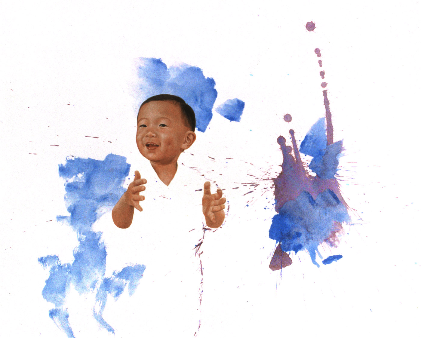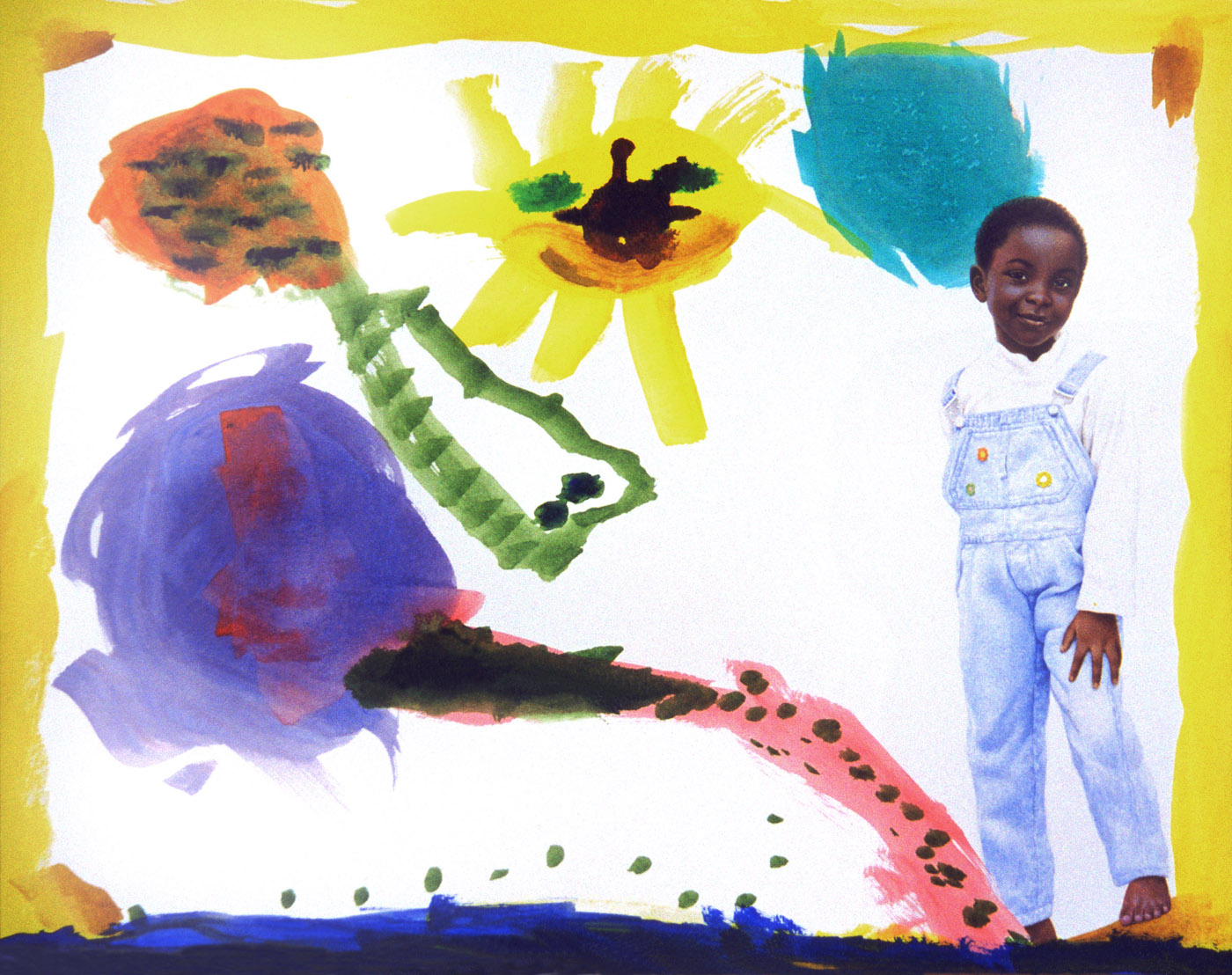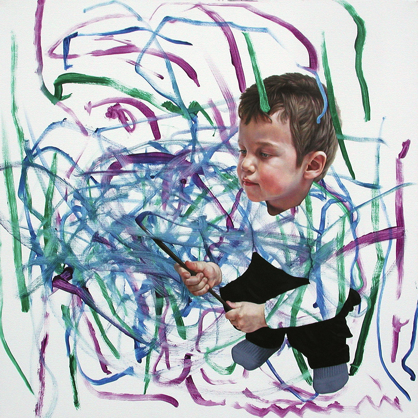 Children set the scene for their own portraits, encouraged to paint as they please. Along with the children, Morris imagines how they might appear within their paintings. He then takes photos, from which he hand-paints the portraits directly onto the children's paintings.