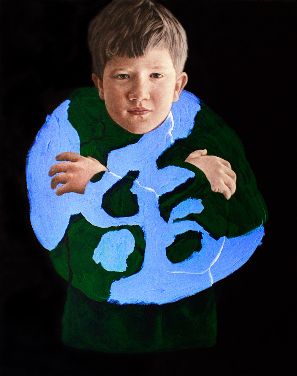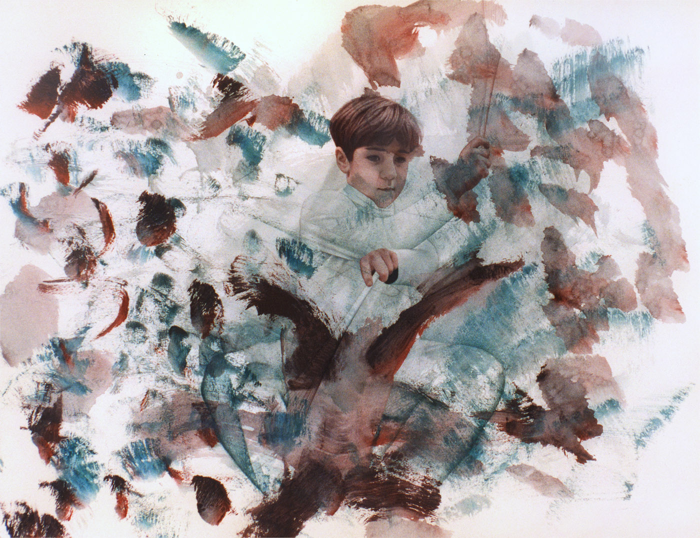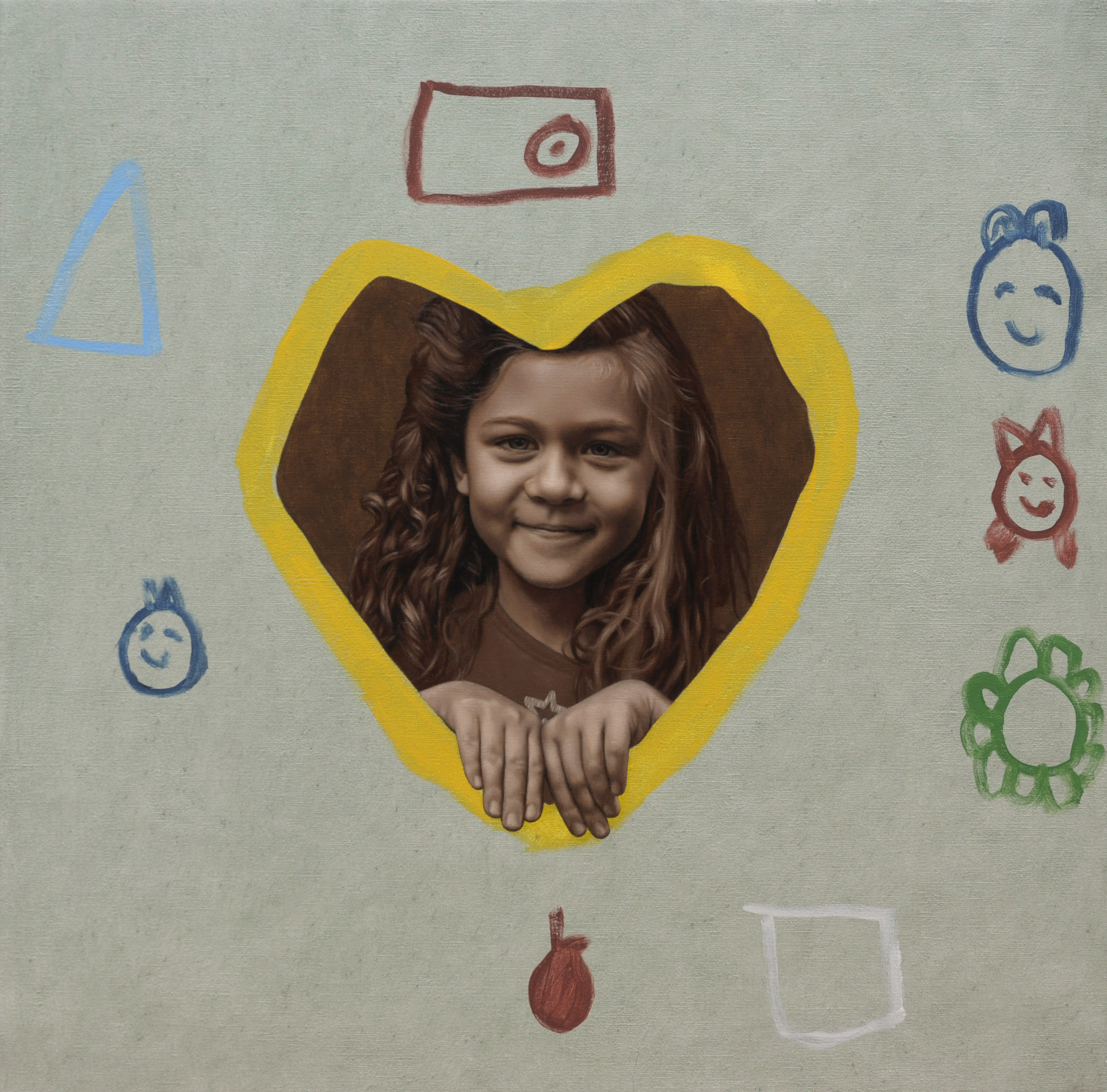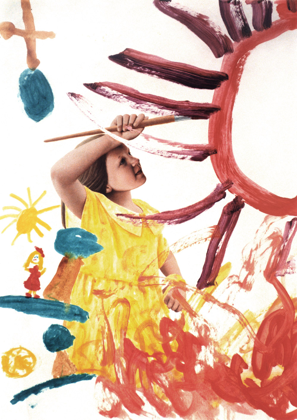 Children set the scene for their own portraits, encouraged to paint as they please. Along with the children, Morris imagines how they might appear within their paintings. He then takes photos, from which he hand-paints the portraits directly onto the children's paintings.