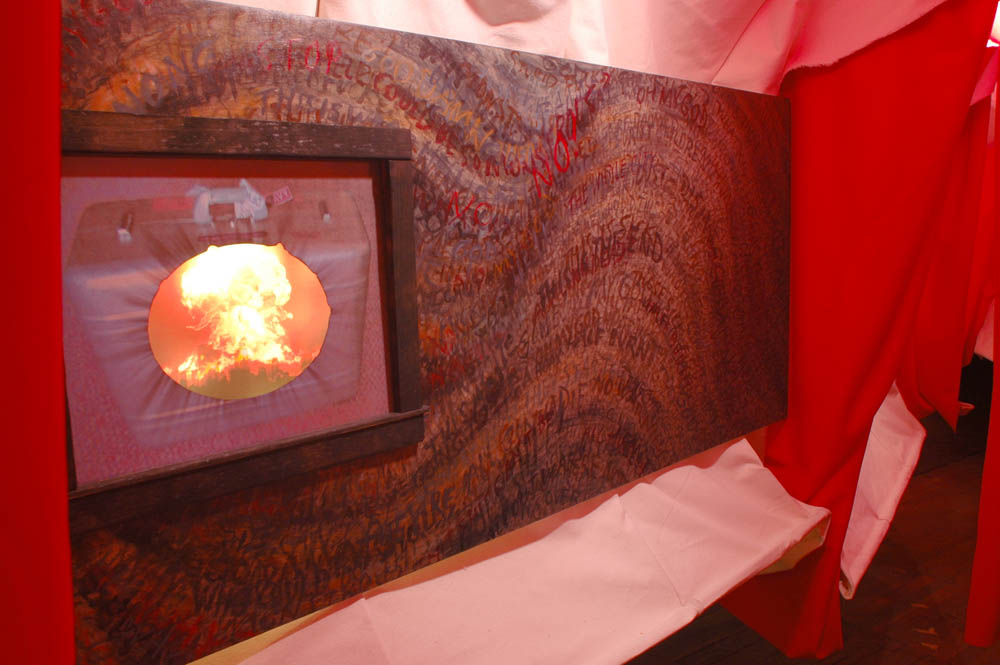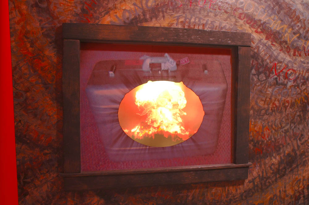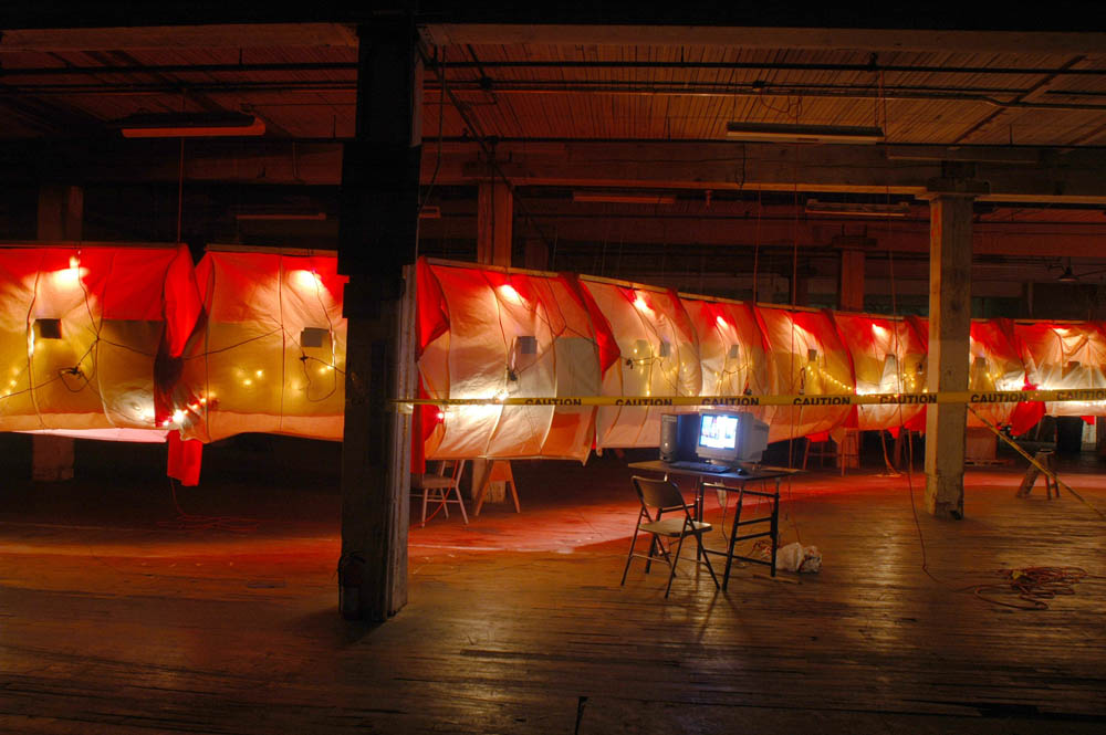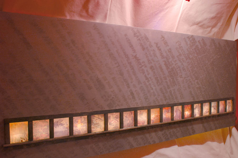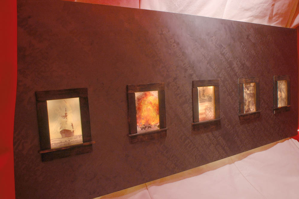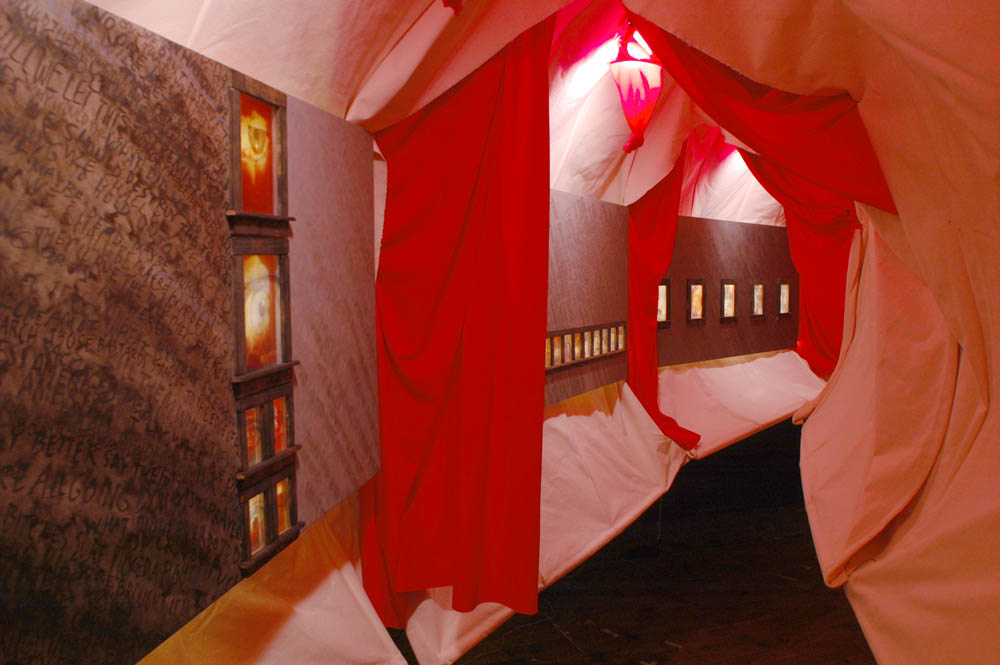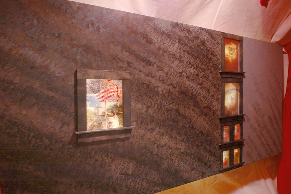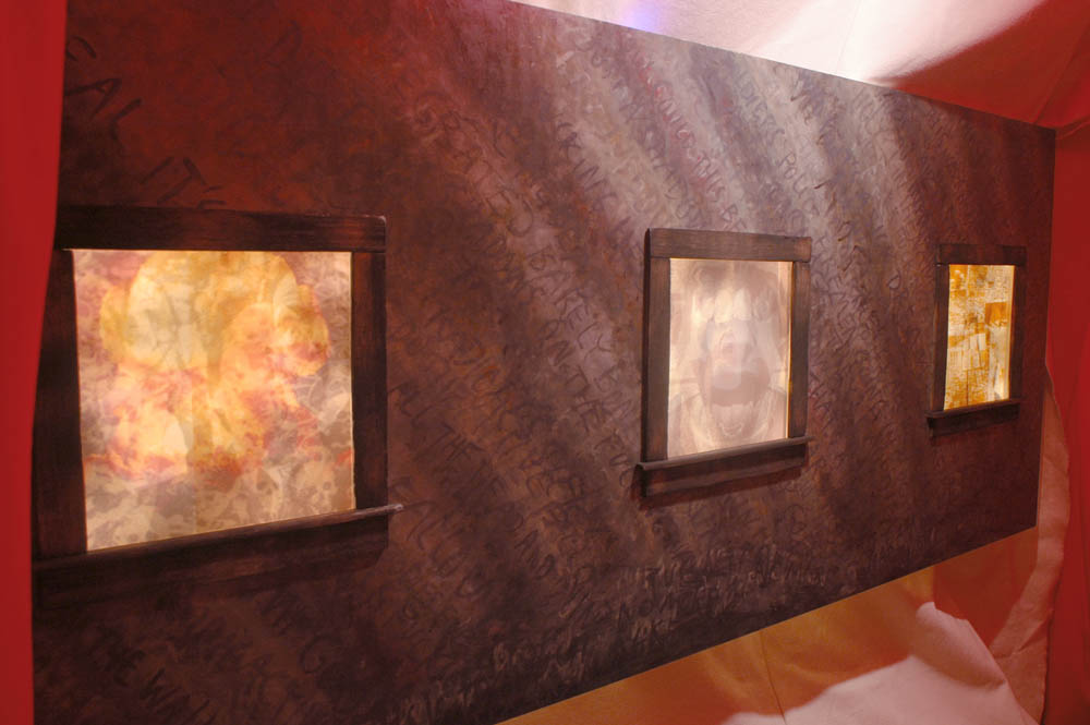 At the Dubuque Museum of Art's "Voices" exhibition, 2005Twelve painted panels were shown inside a 60' long canvas tunnel suspended from the ceiling. Multi-layered illuminated transparent images showed events unfolding in a post-suitcase-nuke America. Words painted on the panels showed the thoughts of an American living through the events. Each section of the tunnel had its own looping track of music. As visitors moved through the tunnel, they experienced the soundtrack in their own time.
