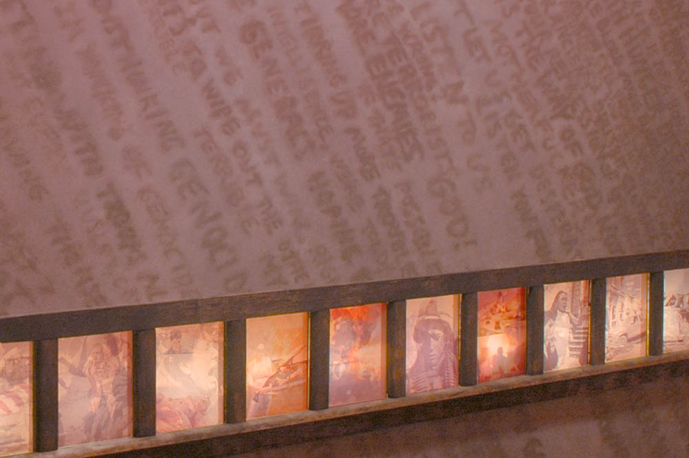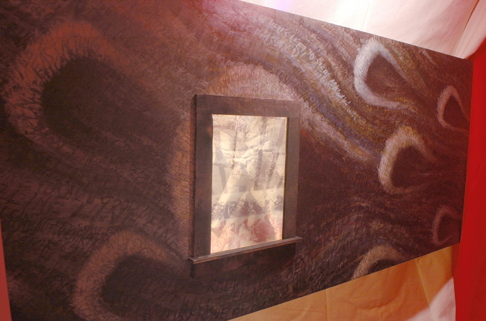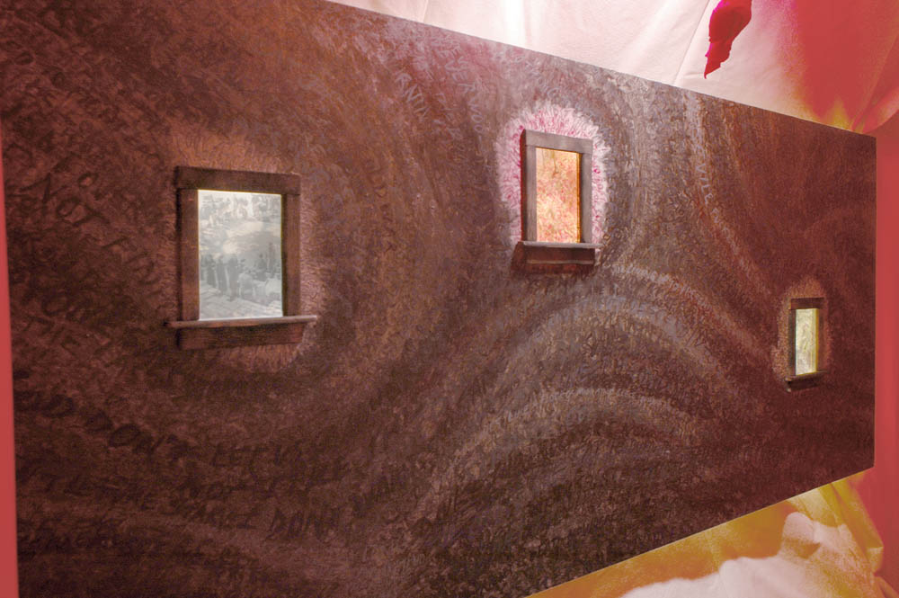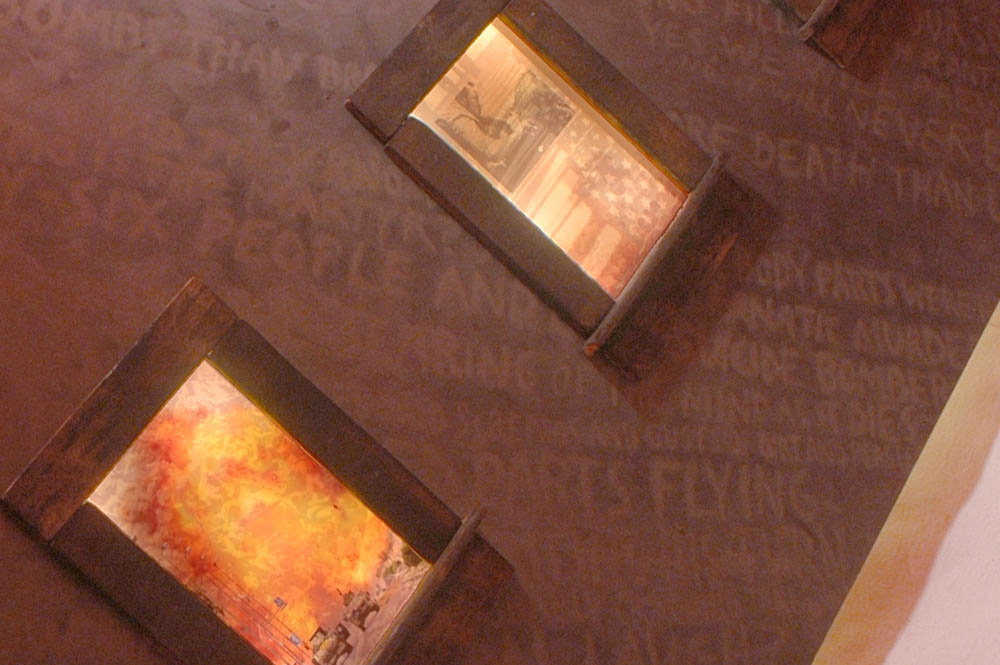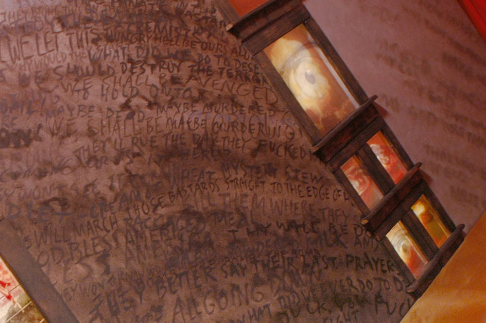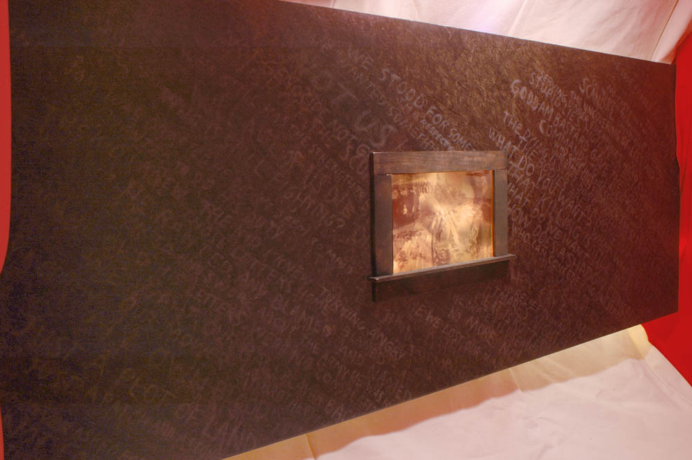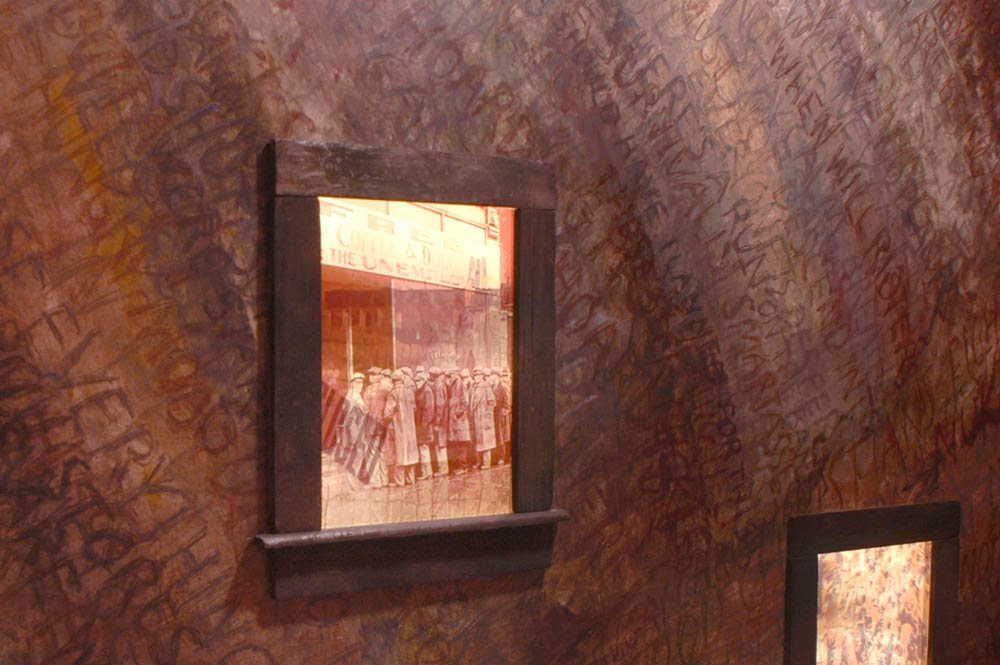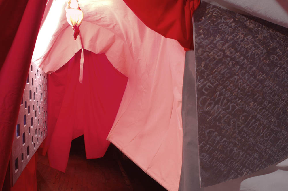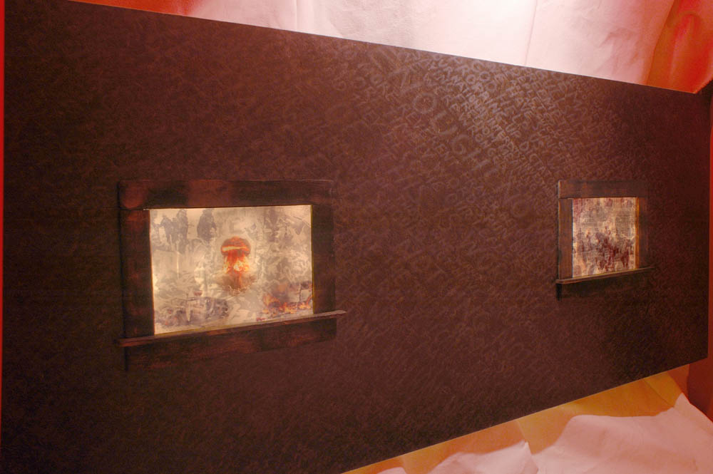 At the Dubuque Museum of Art's "Voices" exhibition, 2005Twelve painted panels were shown inside a 60' long canvas tunnel suspended from the ceiling. Multi-layered illuminated transparent images showed events unfolding in a post-suitcase-nuke America. Words painted on the panels showed the thoughts of an American living through the events. Each section of the tunnel had its own looping track of music. As visitors moved through the tunnel, they experienced the soundtrack in their own time.