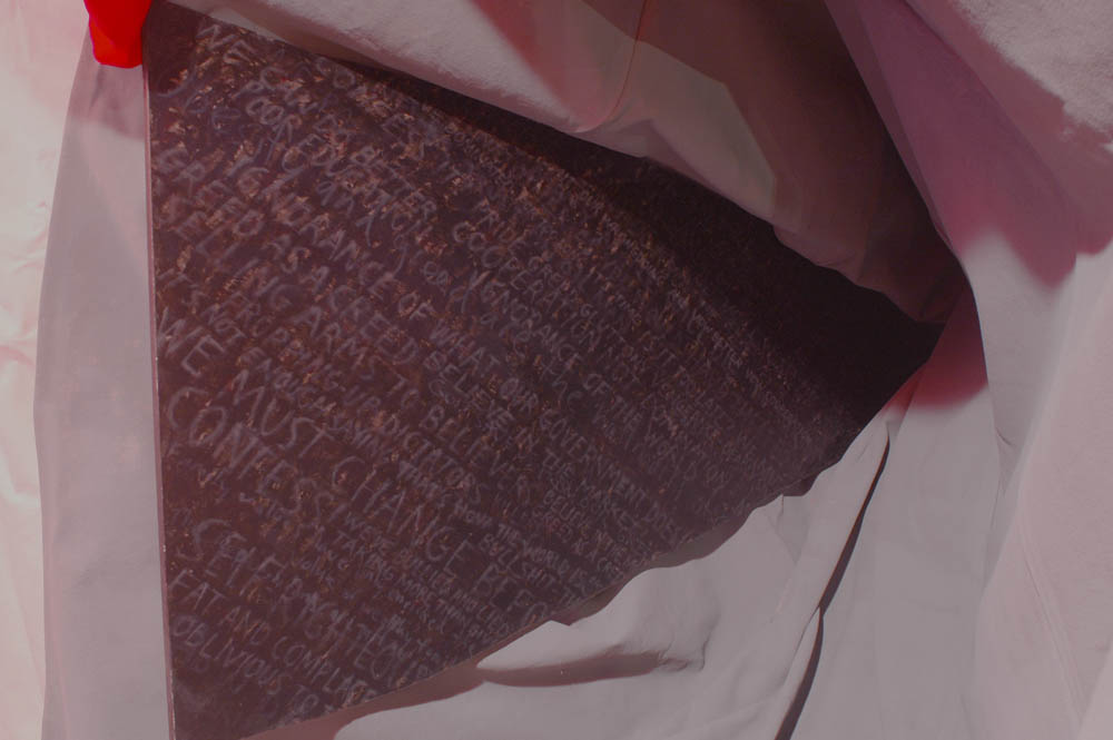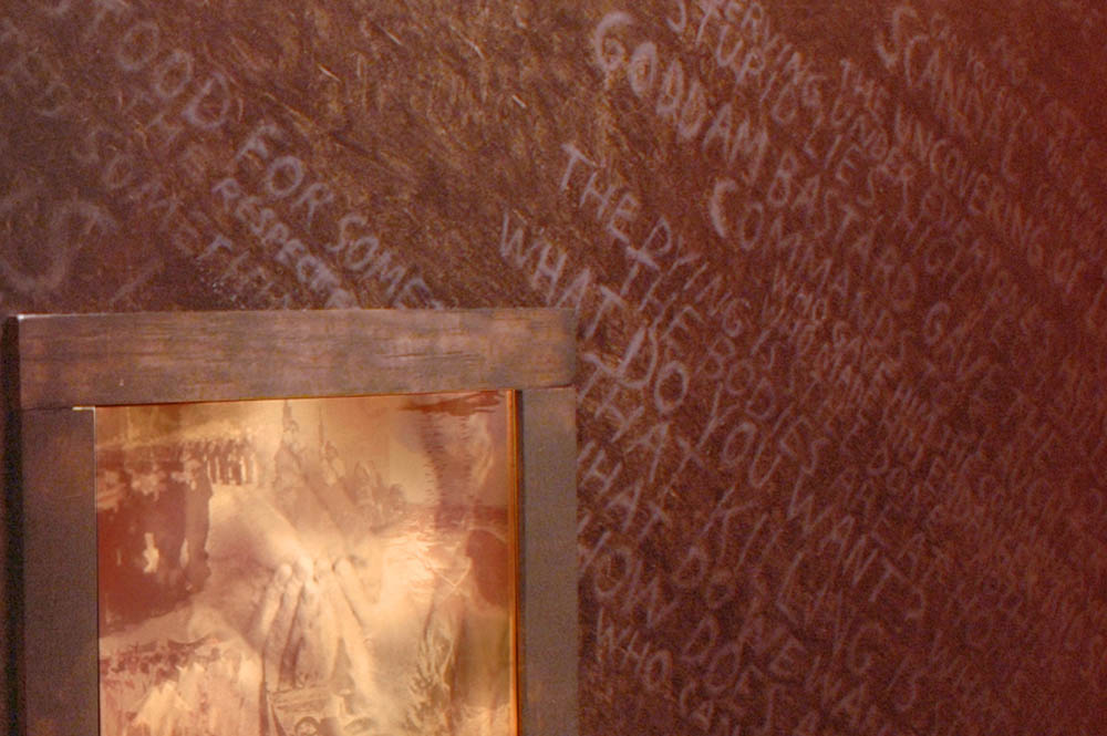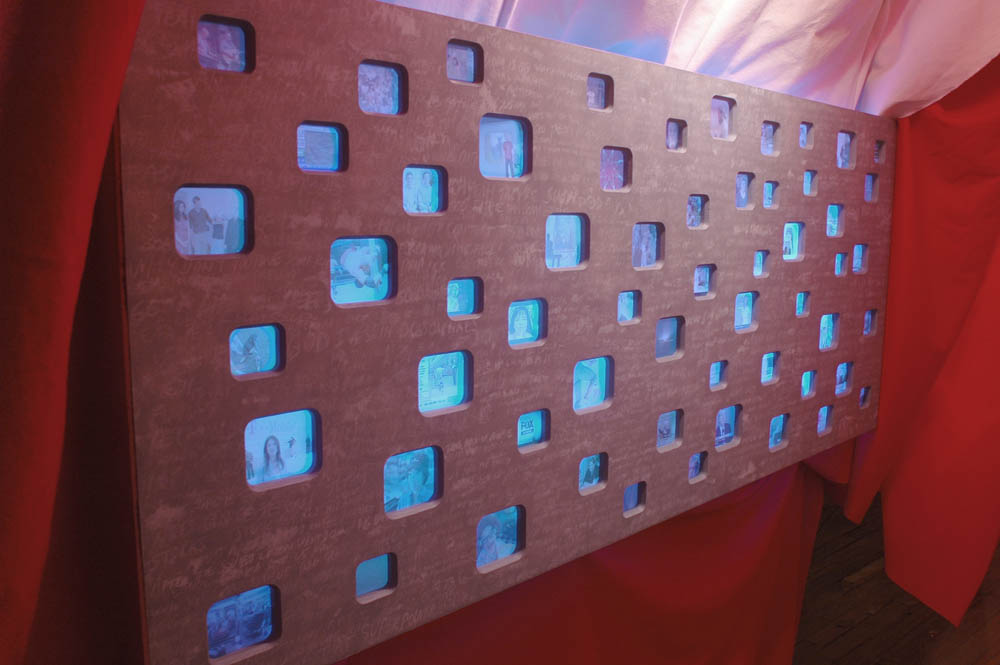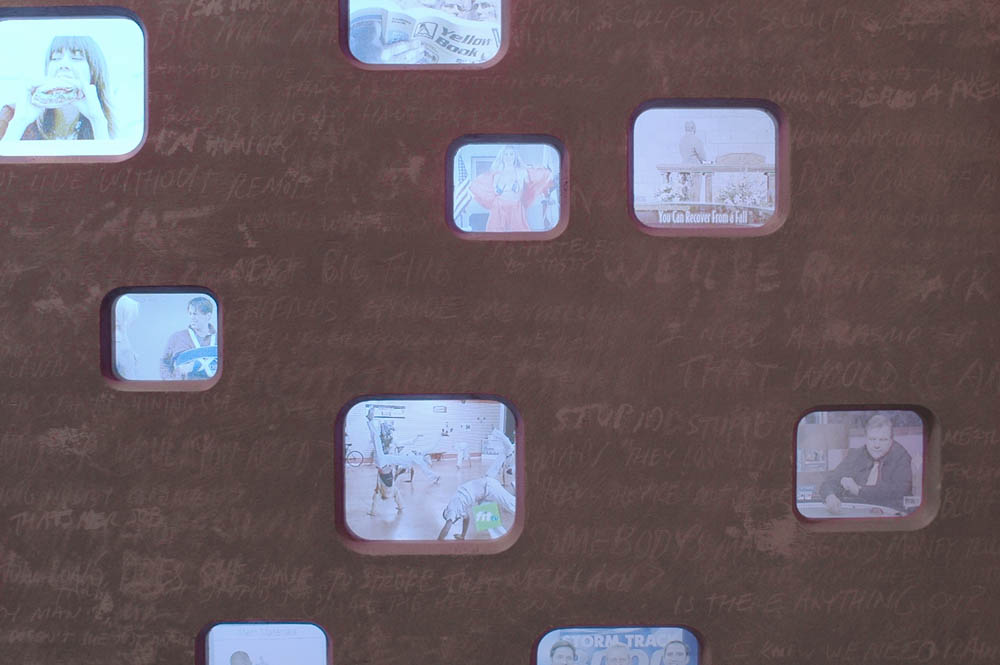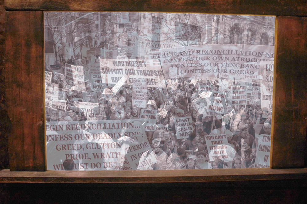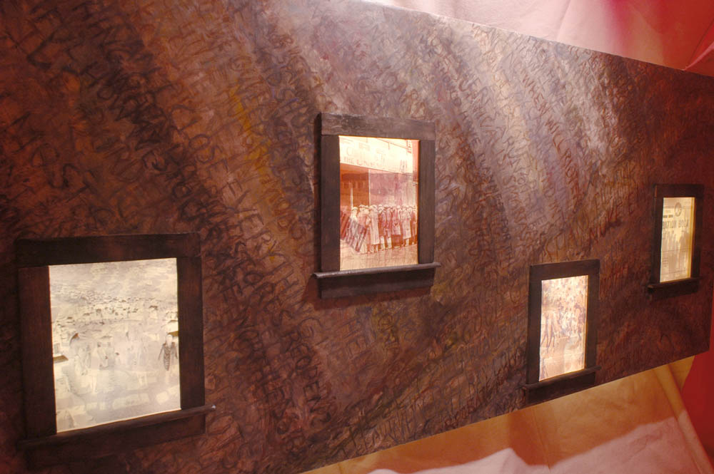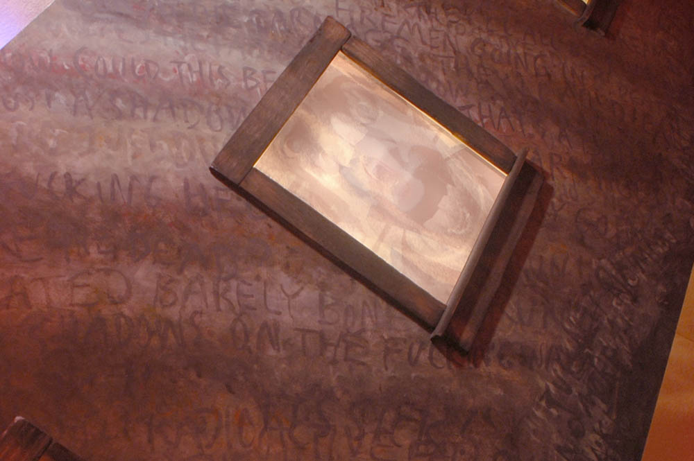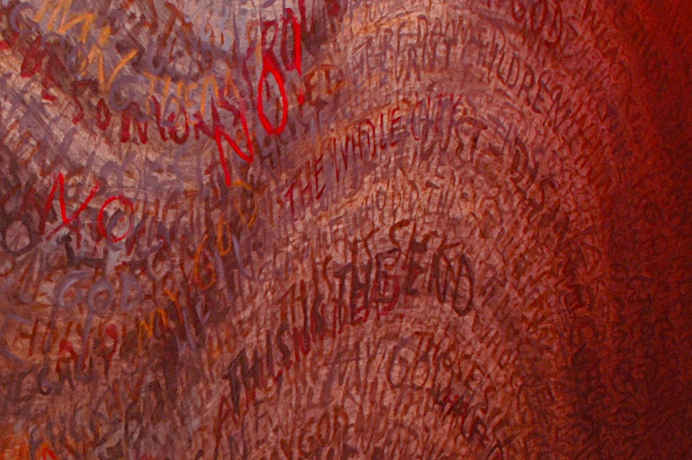 At the Dubuque Museum of Art's "Voices" exhibition, 2005Twelve painted panels were shown inside a 60' long canvas tunnel suspended from the ceiling. Multi-layered illuminated transparent images showed events unfolding in a post-suitcase-nuke America. Words painted on the panels showed the thoughts of an American living through the events. Each section of the tunnel had its own looping track of music. As visitors moved through the tunnel, they experienced the soundtrack in their own time.